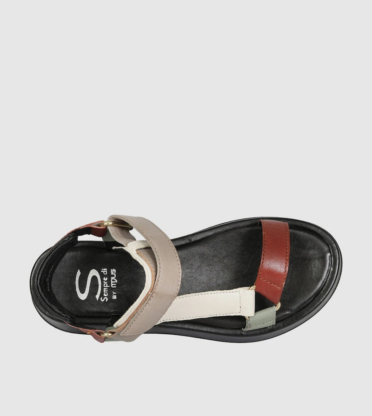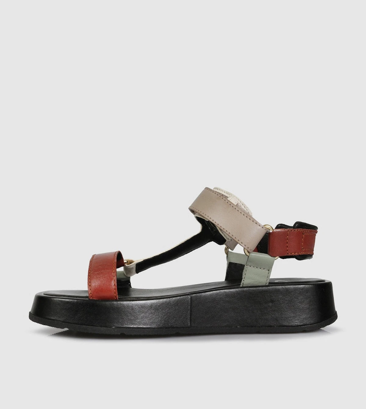 Ermyne sandals provide a stylish and comfortable look with its leather-covered flat form and iconic velcro strap asymmetric design. The padded foot bed offers extra cushioning and support, while the multicolored upper lets you express your unique style.