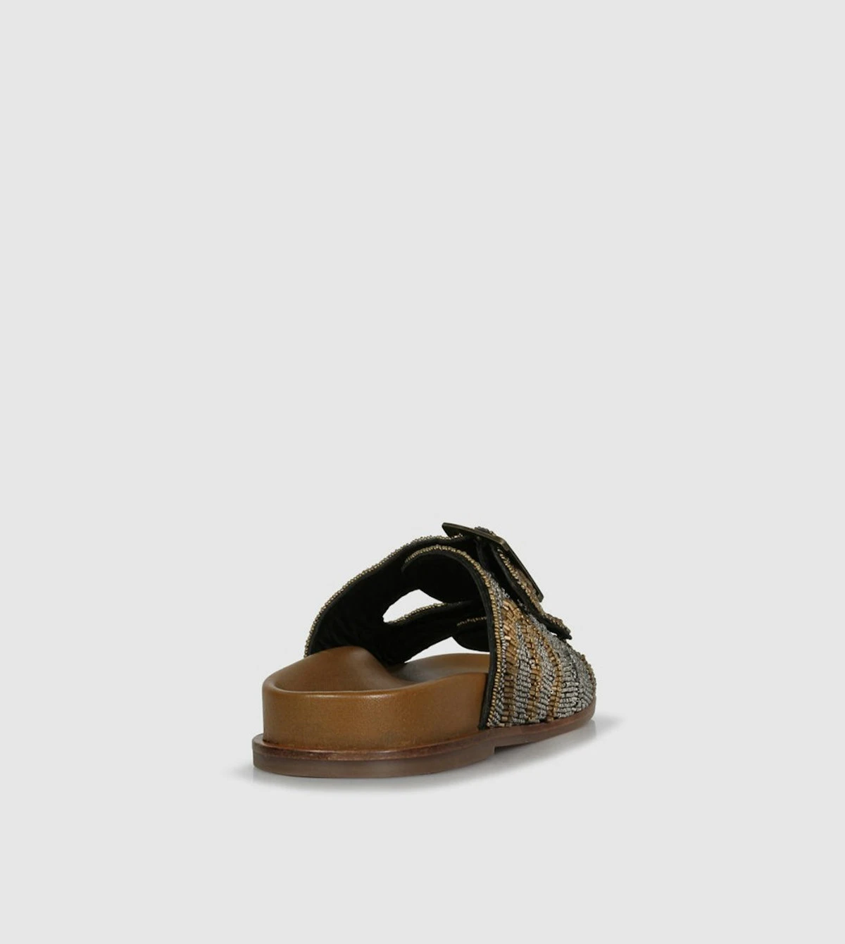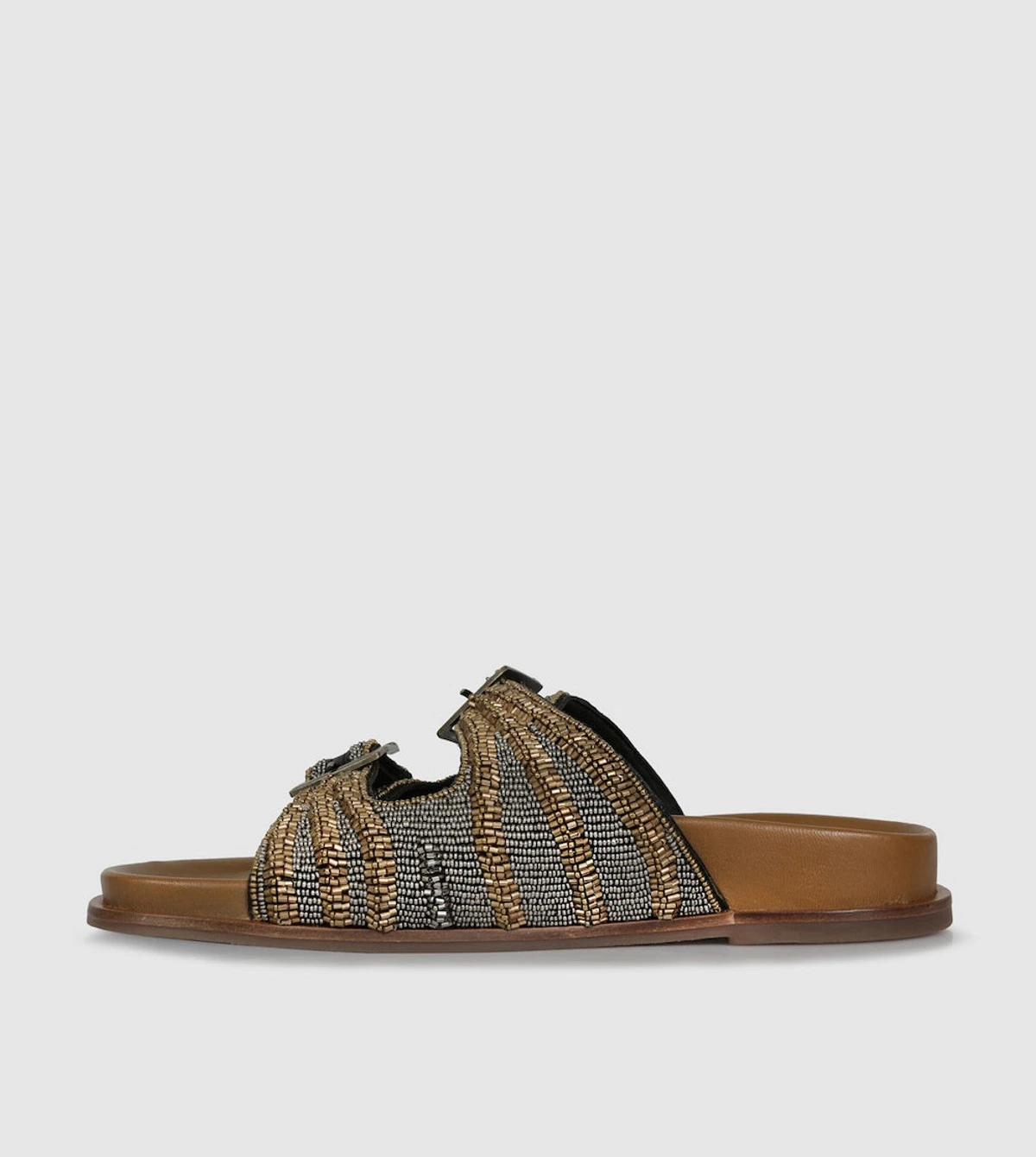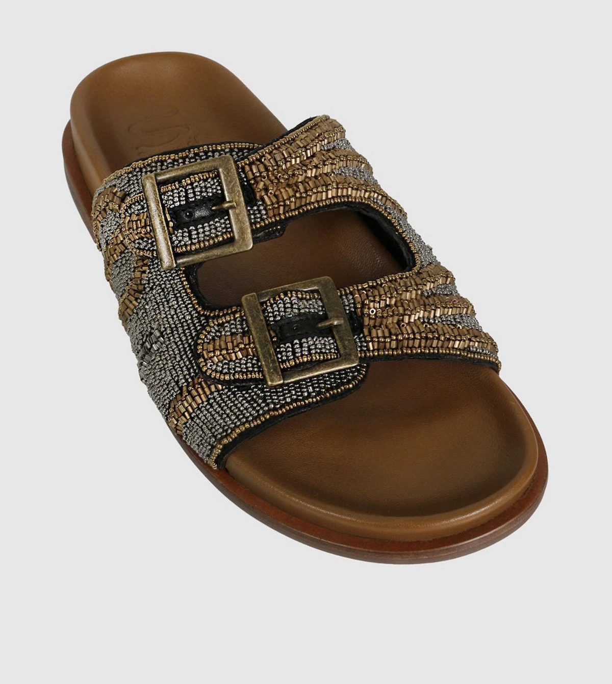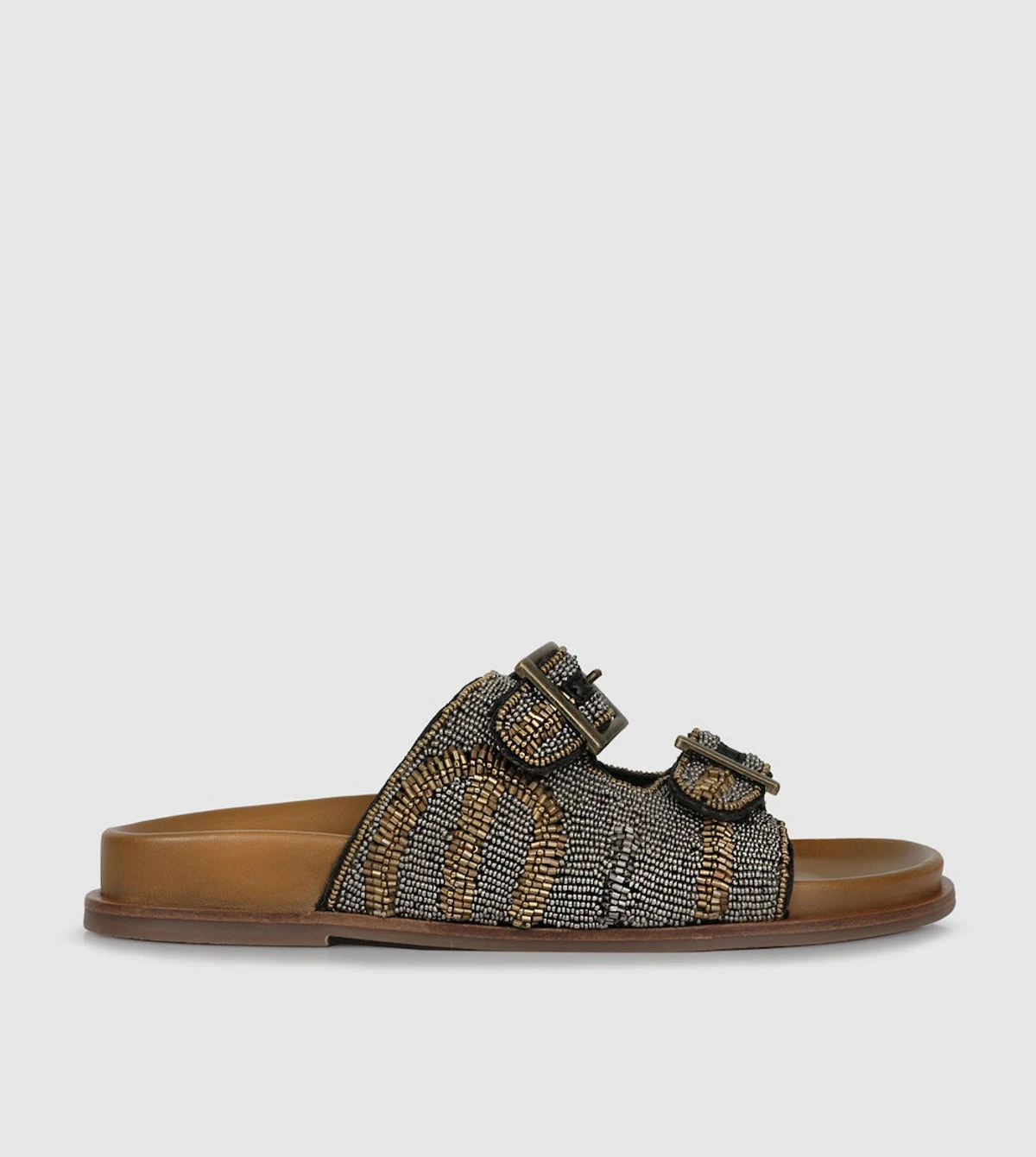 Fable Slides by S sempre di offer a fun and stylish option for your foot-bed sandals. Crafted with multicolor metal beading and antiqued metal square buckles, these slides provide a secure fit with a fashionable flair. Enjoy comfortable, versatile, and unique style with Fable Slides.
